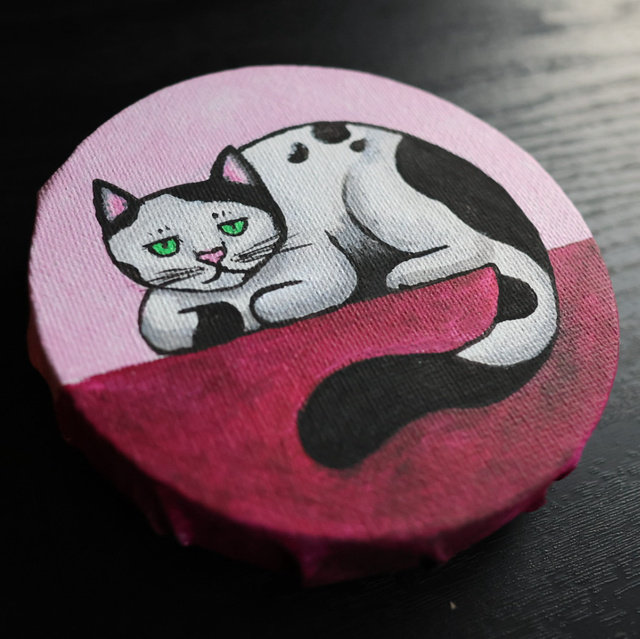 Check out this cartoon style cutie, dashing in pink and burgundy. This small round canvas holds a hand-painted black and white cat sitting pretty on an abstract duo tone pink background.